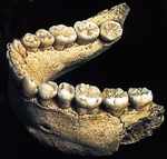 Возраст находки делает ее наиболее древним представителем архантропов вне пределов Африканского континента. В этом же месте ранее были найдены два черепа и нижние челюсти, ныне причисляемые также к виду Homo georgicus. Характеристика: V черепа D2700 - 600-680 см 3 (самый маленький и примитивный для гоминид, живших вне Африки). Меньшим объемом обладал только Homo floresensis, обнаруженный позднее "грузинского человека". У черепа D2280 объем мозга - приблизительно 780 см3, черепа D2282 - около650 см3. Несмотря на сравнительно небольшой объем, краниальные останки Homo georgicus отличаются от первых африканских архантропов - Homo habilis и Homo rudolfensis - и по ряду признаков сближаются с ранними африканскими Homo erectus. Рост Homo georgicus предположительно составлял 1,4-1.5 м. Возраст: предположительно 1,8 млн. лет т.н. Где были найдены останки: Грузия, местечко Дманиси. Дополнительная информация: Весьма любопытная информация была опубликована в 2005 году. Один из черепов, обнаруженных в Дманиси, D3444 и нижняя челюсть D3900 характеризуются полным отсутствием зубов, за исключением одного, причем большинство из них были потеряны задолго до смерти индивида. Возраст его приблизительно был оценен в 40 лет. Возникает вопрос, как человек с полным отсутствием зубов смог выжить, как пережевывал пищу? Это обстоятельство позволило профессору Д.Лордкипанидзе предположить, что жизнь D3444 была возможна благодаря существенной поддержке сородичей, что является наиболее древним примером взаимопомощи среди гоминид - наших предков. | |
