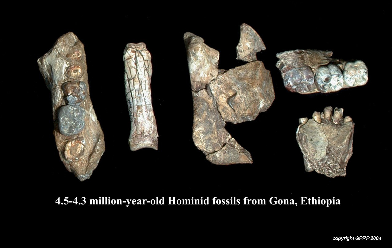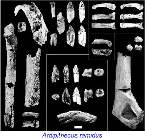 Обнаружен в 1994 году Тимом Уайтом и его коллегами в области Aramis в регионе Middle Awash (Эфиопия). Первоначально его причислили к семейству австралопитеков, но позднее пересмотрели эту точку зрения из-за явных отличий в физическом строении австралопитеков и ардипитека. Характеристика: Найдены останки 17 различных особей: отдельные зубы, часть основания черепа, кости левой руки одного индивидума... Известные на сегодняшний день физические черты черты A.ramidus можно разделить на две группы: - сближающие его с обезьянами; - сближающие его с австралопитеками. Зубы A.ramidus в основном напоминают по своему строению зубы обезьян, что подразумевает диету, весьма отличную от гоминидной. Отличительной особенностью A.ramidus являются более крупные по отношению к коренным зубам клыки верхней и нижней челюсти (но не столь крупные, как у современных обезьян). По строению черепа близок к шимпанзе. Поскольку не найдены кости нижних конечностей, мы не можем судить, было ли это существо прямоходящим. Однако косвенные свидетельства, прежде всего расположение foramen magnum, говорят в пользу предположения, что если это существо и не было прямоходящим в нашем смысле этого слова, то уже сделало первые шаги в данном направлении. Кости руки показывают смесь как обезьяньих, так и человеческих признаков. В настоящее время не рассматривается как исходная форма человеческой эволюции. Время существования: 4,5-4,4 млн. лет т.н. Где были найдены останки: Восточная Африка (Эфиопия)
