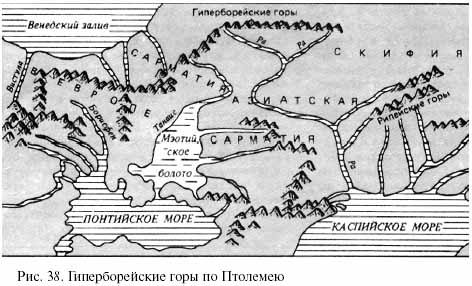 На карте Птолемея нанесена длинная горная цепь - Гиперборейские (Рифейские) горы. Этот хребет на Русской равнине точно совпадает с краем ледникового щита Валдайского оледенения" - утверждает А.А. Сейбутис и приводит карту, показанную на рисунке 38 [2, 102-10].