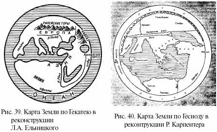 А на рисунках 39 и 40 показаны представления о Земле Гекатея Милетского в реконструкции Л.А. Ельницкого [1, 20] и Гесиода в реконструкции Р. Карпентера [2, 105].