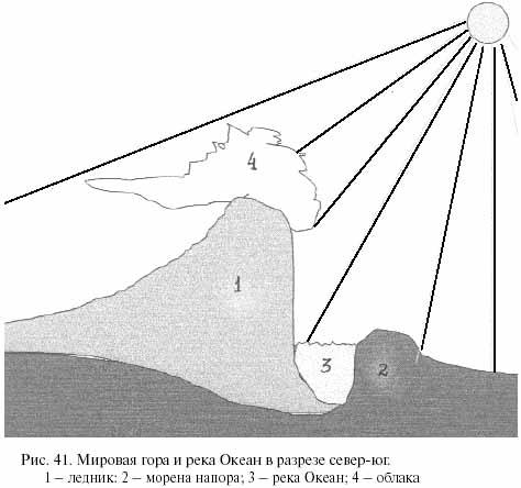 По нашему мнению, река Океан действительно существовала и была порождением ледника. Южный край ледника, опоясывавший всю северную часть Земли в широтном направлении, своей тяжестью прогибал земную кору и выдавливал перед собой огромный земляной вал, так называемую "морену напора". Это явление известно геологам. Пространство между ледником и мореной напора заполнялось талой водой ледника и конденсирующейся на его южном склоне атмосферной влагой, образуя то, что древние именовали рекой Океан.