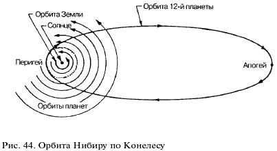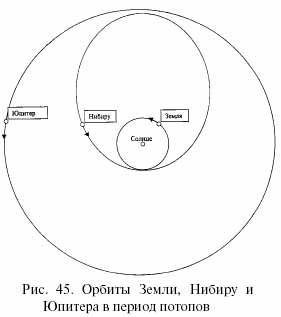При таком расположении физическое воздействие планеты Боде-Тициуса на Землю не могло быть существенным. Но можно предположить, что ее орбита, которая вначале была круговой, под влиянием тяготения Юпитера, самой большой планеты Солнечной системы, постепенно деформировалась, становясь все более вытянутой. Со временем в афелии она стала приближаться к орбите Юпитера, а перигее достигать орбиты Земли. В эпоху наиболее сильных взаимодействий с Землей малая полуось эллиптической орбиты Нибиру примерно равнялась радиусу орбиты Земли, а большая полуось - приближалась к радиусу орбиты Юпитера.