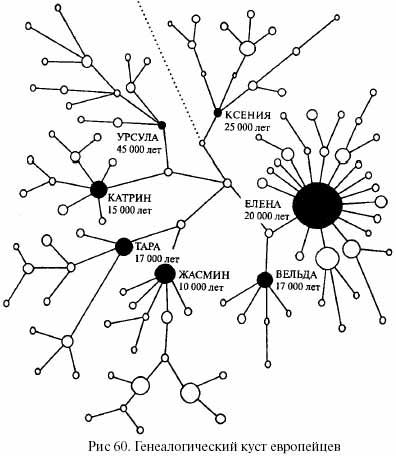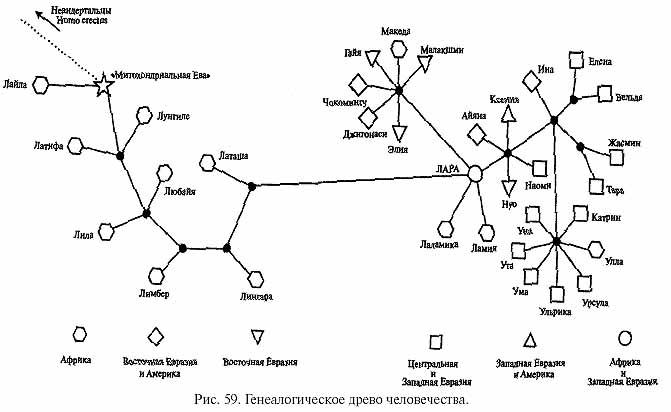 В результате исследований Сайкса и других генетиков было установлено, что все люди, живущие сегодня на Земле (во всяком случае, тысячи случайно выбранных людей различных рас и национальностей, подвергшихся исследованиям), происходят от одной единственной женщины, жившей примерно 150 тысяч лет тому назад в Африке. Генетикам удалось построить генеалогическое древо, отражающее степень родства людей, проживающих в различных регионах Земли. Оно показано на рис. 59 [38, 280-281]. Людей, объединенных происхождением от одной женщины, назвали "кланом", а для того, чтобы их различать, каждой прародительнице клана дали условное имя.