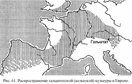 Сказанное выше дает еще одно независимое подтверждение картине распределения древних этносов на территории Европы, нарисованной нами в 4-ой главе первой книги. Проведенные генетические исследования не выявили еще более молодой и многочисленный европейский этнос - кельтов, происходящих, по нашему мнению, от мужчин египетского гарнизона армии Рамзеса II, оставленного им в Скифии в конце XIII века до н.э., и местных женщин полянского племени. Этот этнос был вытеснен скифами в основном в Западную Европу в VII веке до н.э. Карта распределения в Европе памятников гальштатской культуры V века до н.э., принадлежащей кельтам, показана на рис. 61 [39, 52].