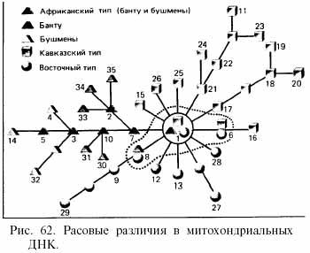 Исследования генетиков показали, что трем расам соответствуют три разновидности митохондриальной ДНК. В связи с этим у генетиков "появилось предположение, согласно которому вид Homo sapiens произошел от одной популяции, обладавшей тремя основными типами митохондриальной ДНК. В дальнейшем эта популяция мигрировала в трех различных направлениях, т.е. в Африку, Азию и Европу" [40, 131]. Последующие смешения трех первичных рас привели к появлению большого числа форм митохондриальной ДНК (их выявлено 35) на основе трех исходных. Это видно на рис. 62 [40, 132].