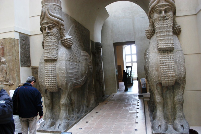 Изваяния грозных и высокомерных крылатых быков с надменными человеческими глазами, стоящих на страже у ворот гигантского дворца Саргона II в городе Дур-Шаррукине (ныне Хорсабад в Ираке), имели магическую охранительную функцию. Пять ног крылатого чудовища создавали иллюзию движения, позволяя видеть его неподвижным анфас или идущим в профиль в зависимости от положения зрителя. До сих пор это существо поражает воображение остроумным композиционным решением. Каменные чудовища из дворца Саргона II (весом в 21 тонну каждое) хранятся сейчас в Париже, в Лувре.