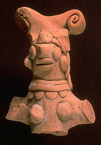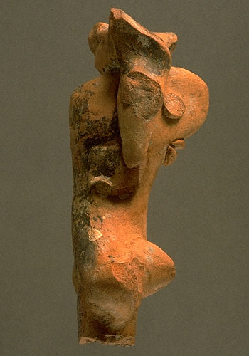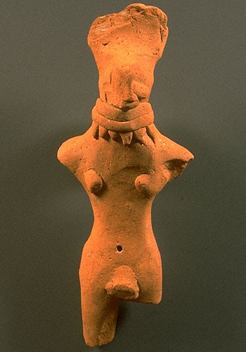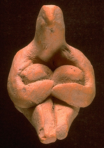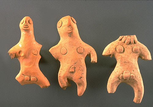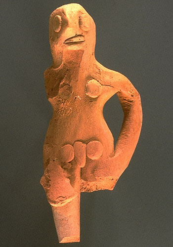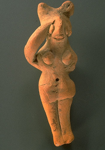 Женская фигурка в головном уборе с двойной спиралью, который, как правило, оформлены и иногда окрашены в черный цвет. Женские фигурки, как правило, изображены стоя ноги прижаты друг к другу вплоть до ступней, а иногда с поднятыми руками к голове.