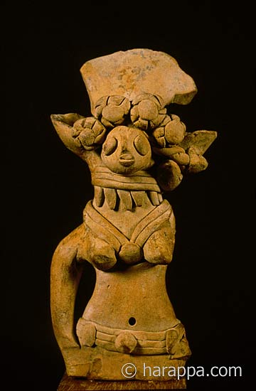 with horned headdress and bangles on both arms, standing in a pipal (sacred fig)