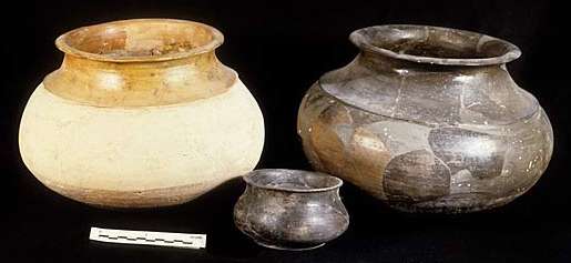 Ledge shouldered cooking pots with low neck and flaring rim. One vessel has red slip on the neck and rim, while the other is fired grey-black. A small black fired bowl is seen in the foreground. Period III, Harappan, 2300-2200 B. C.