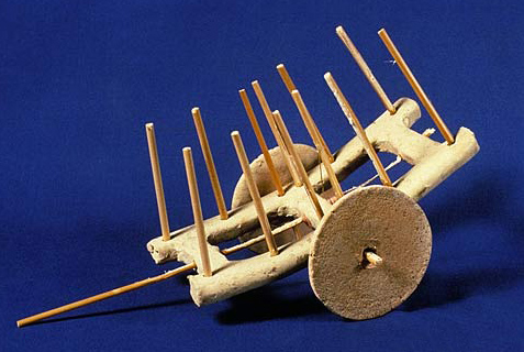 Terra cotta toy carts from the Harappan period site of Nausharo in Baluchistan. Holes along the length of the cart serve to hold wooden side bars and at the center of the cart two of the wooden side bars can be extended below the frame to hold the axle. A long stick inserted into the holes at the end of the cart would have been used to support a yoke. The two wheels were found lying next to the cart frame. Period III, Harappan, 2300-2200 B. C. Similar carts are still used in rural areas of Pakistan and India .